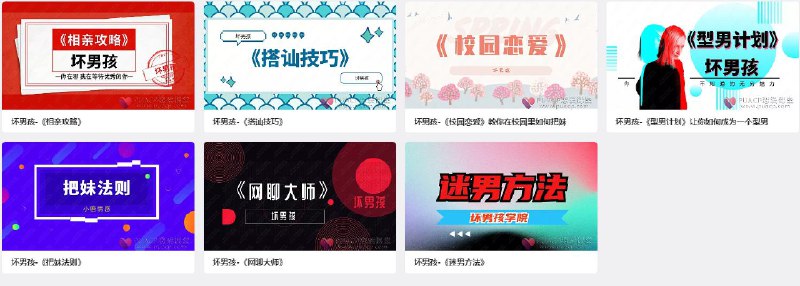 《坏男孩学院 校园恋爱(1)》是坏男孩学院推出的校园恋爱系列资料的第一部分。该资料专注于校园恋爱场景,为处于校园环境中的年轻人提供恋爱指导。内容可能包括如何在校园中结识心仪对象、与校园恋人的相处技巧、处理校园恋爱中的矛盾等方面的知识和策略,帮助学生群体提升恋爱能力,更好地应对校园恋爱中的各种情况