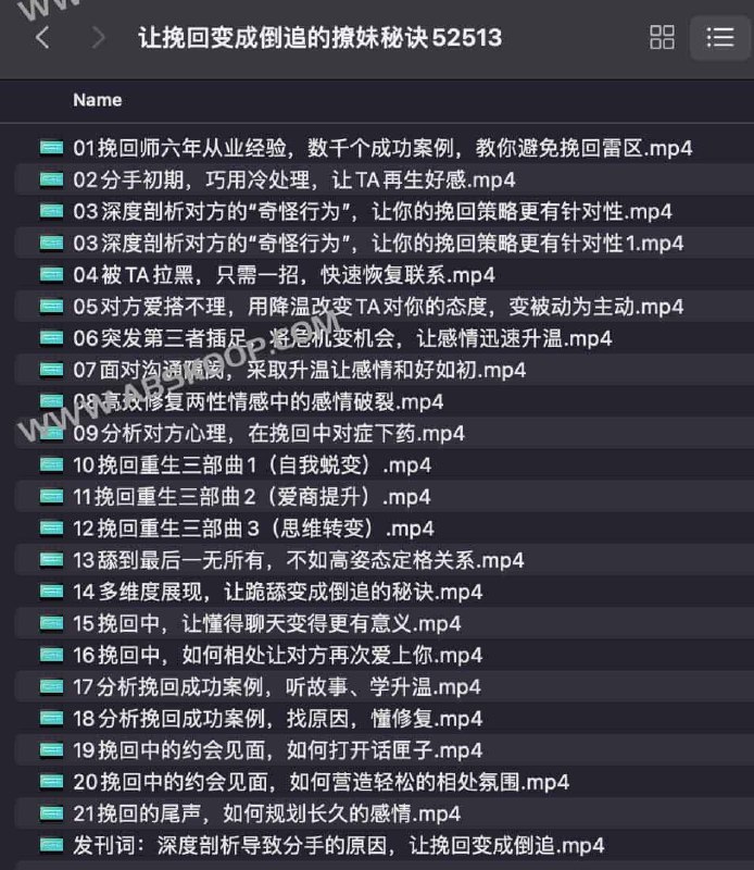 让挽回变成倒追的撩妹秘诀 【课程】【视频】是一门系统性的学习课程,涵盖相关领域的核心知识。通过详尽的讲解和案例分析,帮助学习者深入理解课程主题,提高实践应用能力,适合希望扩展知识储备、提升专业技能的学员。